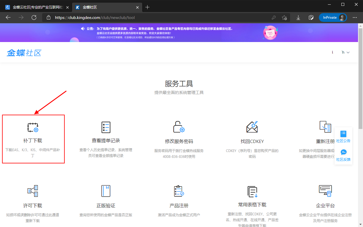 洛陽(yáng)金蝶軟件,溫馨提醒,金蝶KIS產(chǎn)品補(bǔ)丁下載指引 ,進(jìn)vip.kingdee.com ,登錄金蝶云賬號(hào),選擇補(bǔ)丁下載,選擇金蝶對(duì)應(yīng)產(chǎn)品版本 補(bǔ)丁號(hào)下載