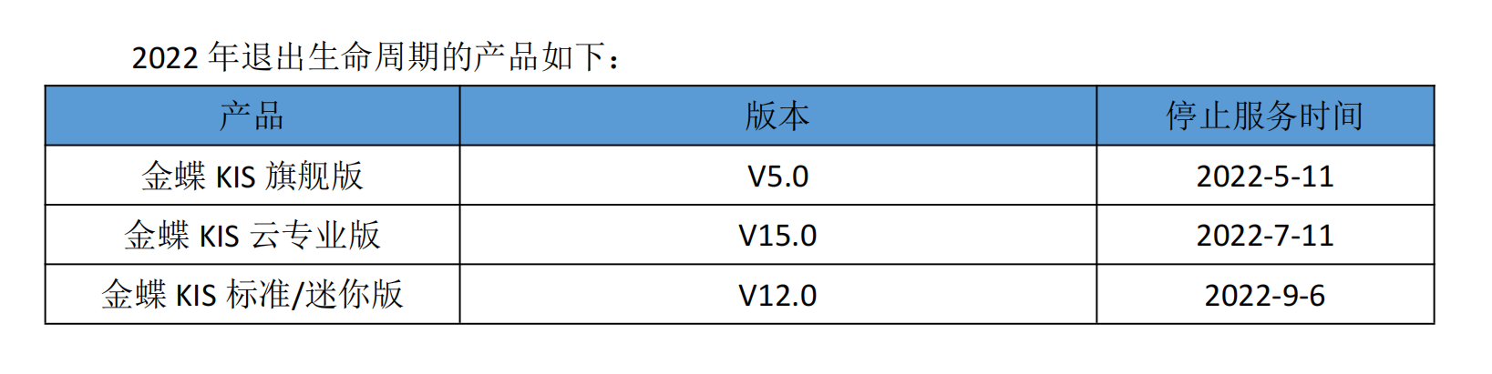 2022 年金蝶 KIS 部分產(chǎn)品退出產(chǎn)品生命周期公告
