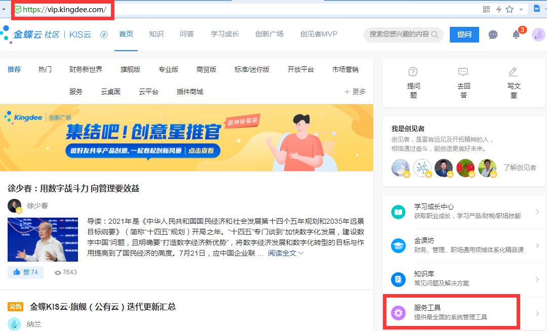 1、打開vip.kingdee.com,點擊右下角的【服務工具】