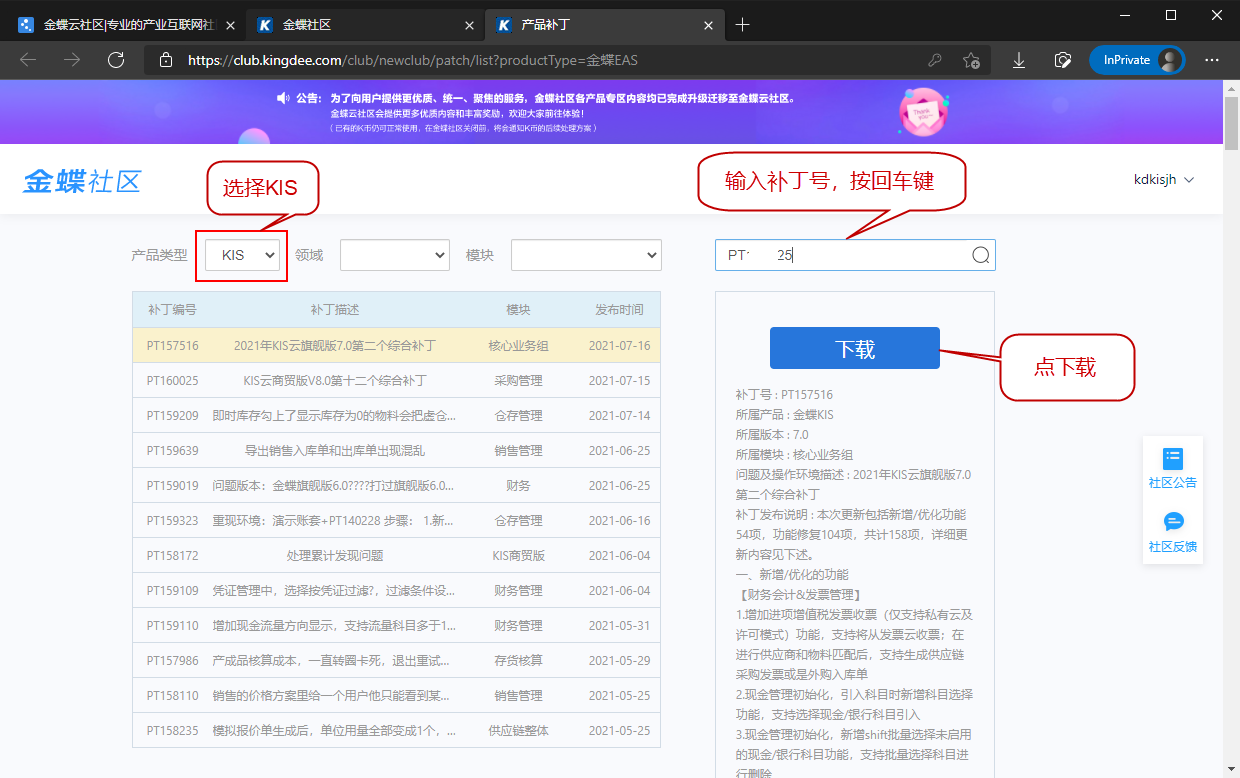 4、產(chǎn)品類型選擇KIS,右邊輸入框輸入補丁號,按回車鍵,再點【下載】