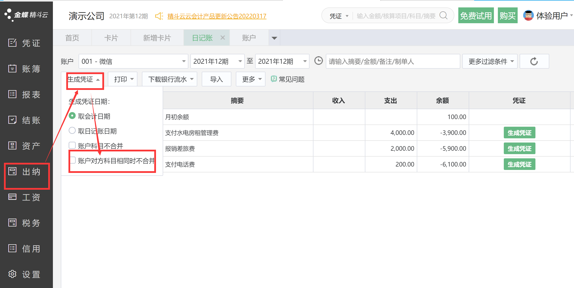 2、日記賬會計科目相同時,系統(tǒng)可以合并生成憑證;